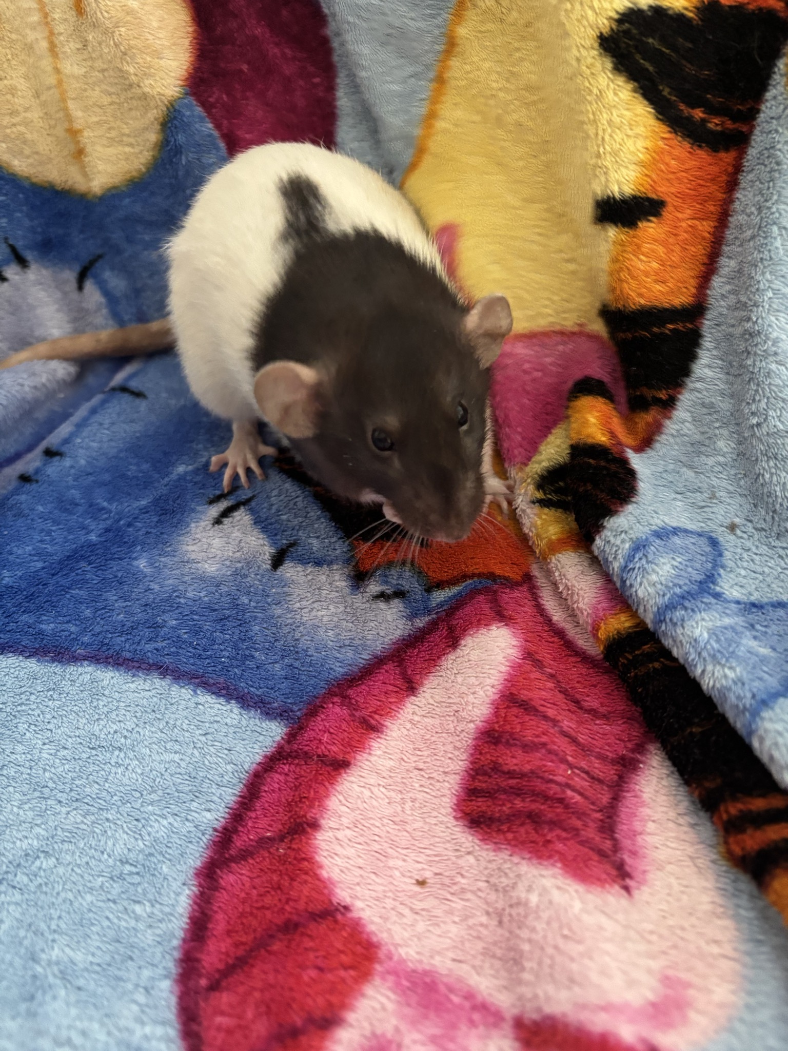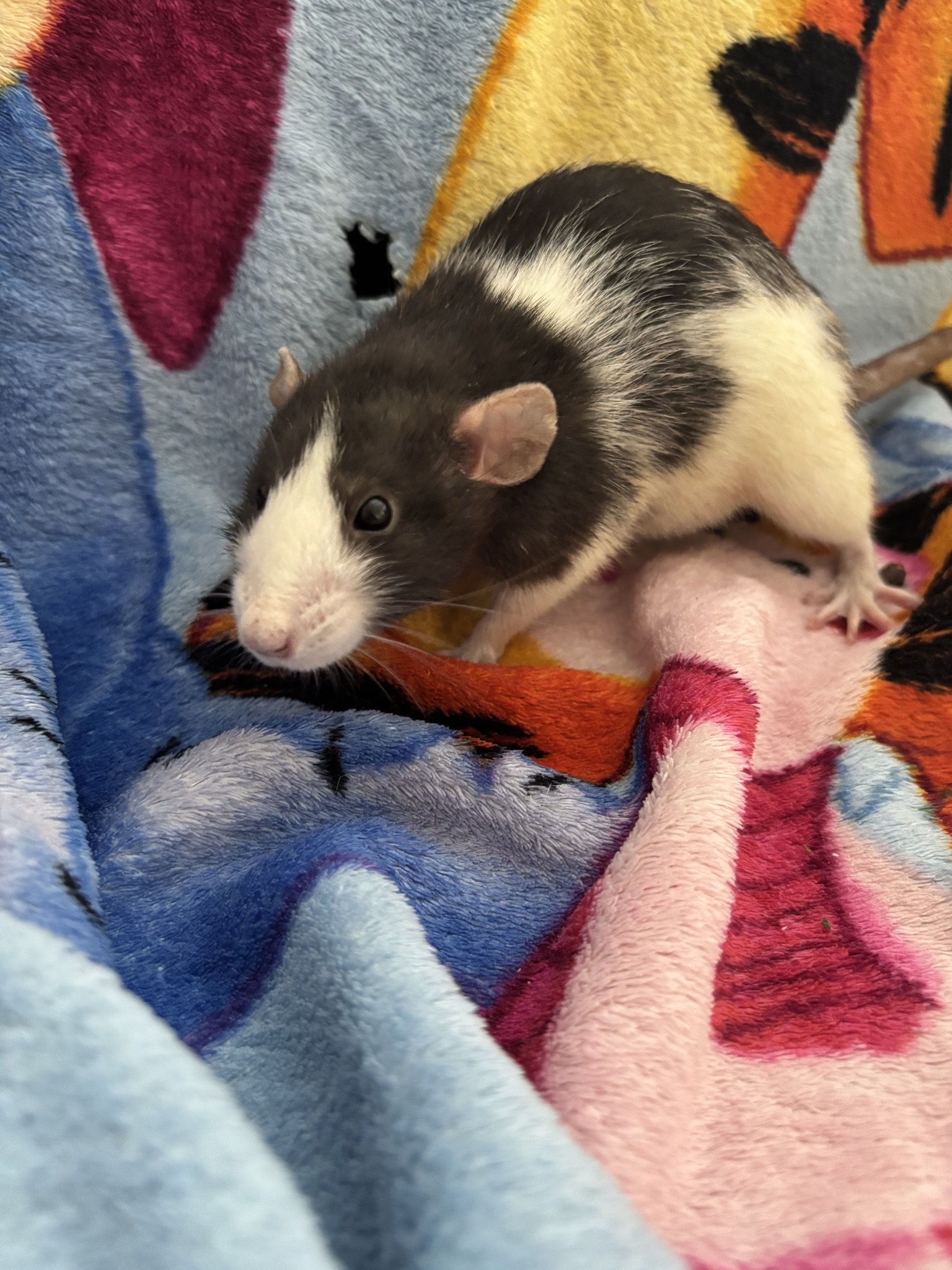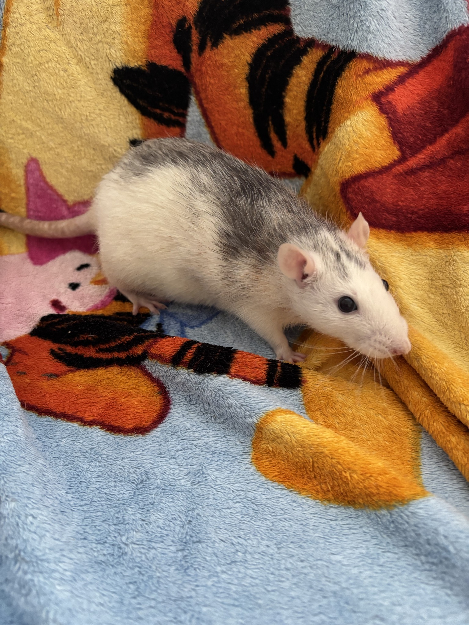 12 Mädels, Alter unbekannt, zwischen 1-2 Jahre, ein Großteil noch am Schnupfen. Bis zum Ende der Parasitenbehandlung sehe ich aber auszugsbereit: Husky, black berkshire, die beiden Creme/Beige hooded, agouti hooded, evtl auch die graue dumbo hooded und die schwarze dumbo hooded